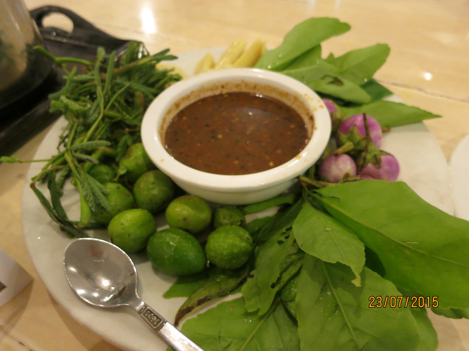 My first encounter with Burmese veggie platter with various leaves, beans, berries and peanut sauce.