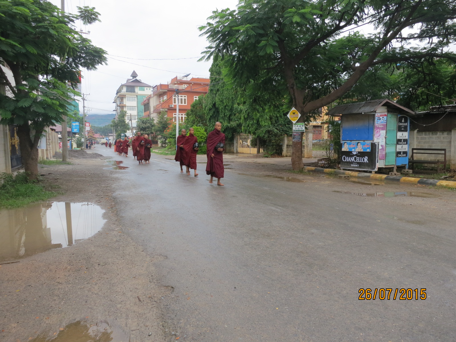 I was pedalling sleepily up the road with the intention of telling my boatman that I had changed my mind when I spotted a column of saffron robes striding purposefully down Strand Road, the main road that ran alongside the river banks. Every couple of street corners or so, locals would greet them carrying pots of hot, newly-cooked rice that they would scoop and dump into the bowls carried by the monks. Their ages ranged from children to senior age. I surmised that they were headed for one of the many pagodas that dotted the landscape of Nyaung Shwe for some kind of Sunday service.
